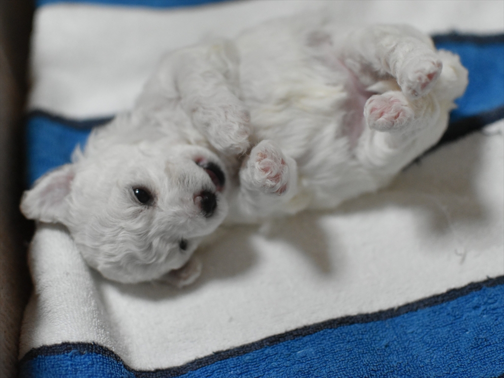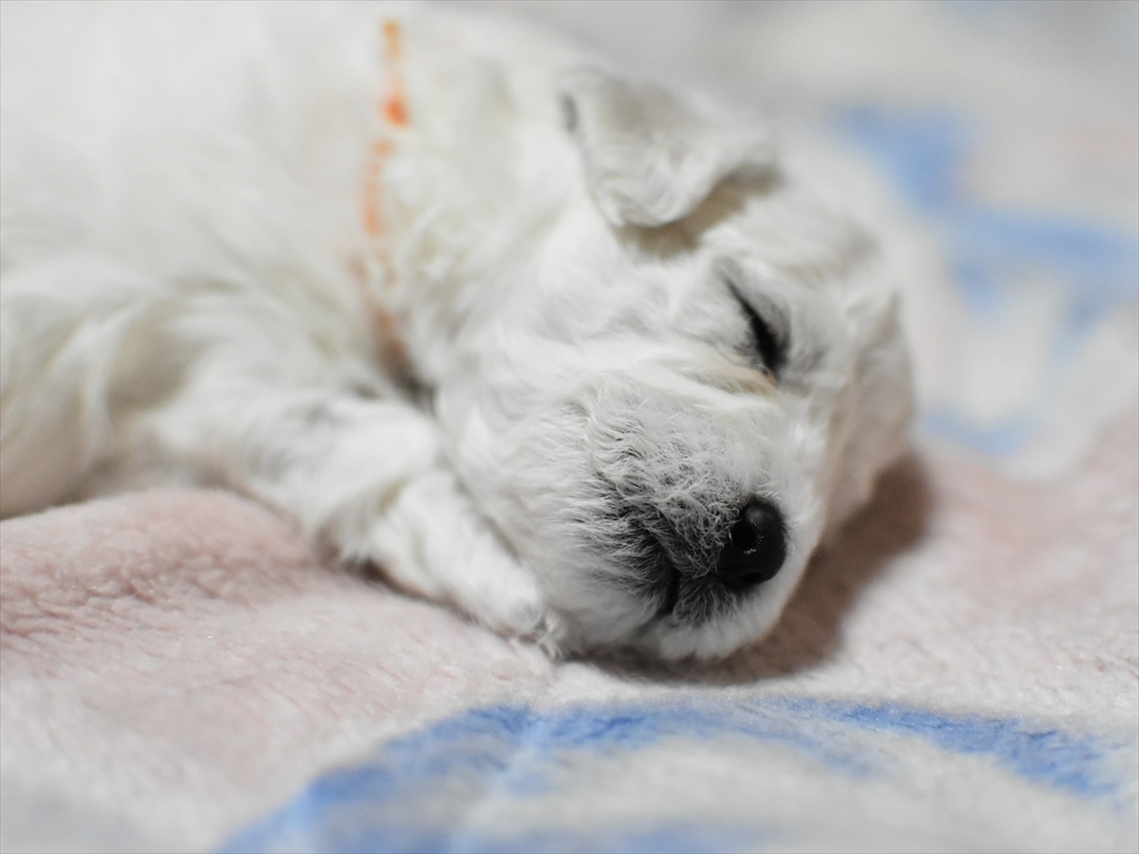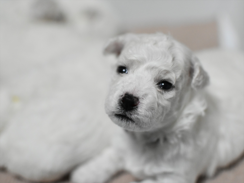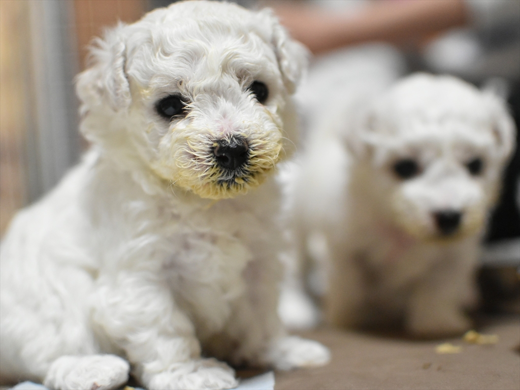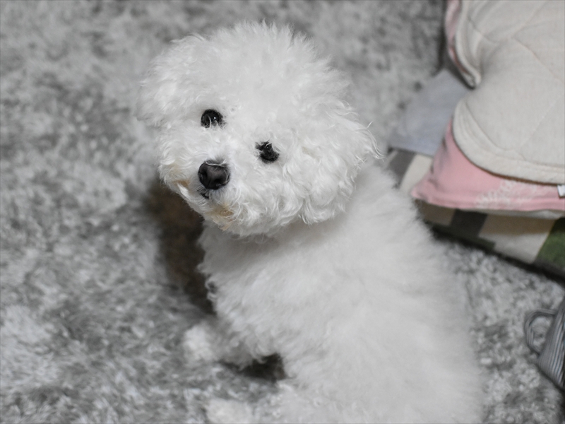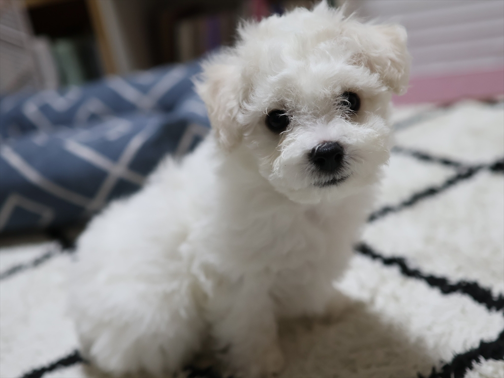 生後2か月近くになると、足腰がプードルに比べてしっかりして口元(マズル)も短め、目がクリっとして、ぬいぐるみみたいに可愛いビションちゃんになります♪
