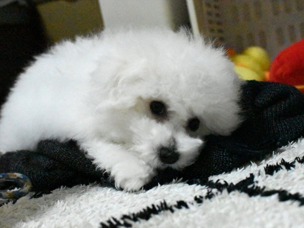 今の時期、体の部分の毛はビションの特徴的な巻き毛ではなく、柔らかな赤ちゃん毛です。